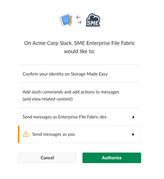 The very first time you click on this link, you will first me asked to authorize the connection between Nasuni Access Anywhere and your Slack account. This is needed so that we can share files on your behalf when you request it.