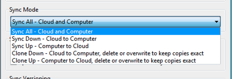Conceptually synchronisation between two directories consists of ensuring that they have the same contents. There are, however, several choices to be made when sync'ing two directories. Here are the modes of synchronisation that Cloud Sync supports: