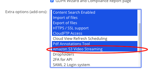 - Scroll down to the “Extra options (add-ons)” list and, holding down the Ctrl key (Windows) or the Command key (Mac) so you don't deselect the items that are already selected, click on “Amazon S3 Video Streaming”.