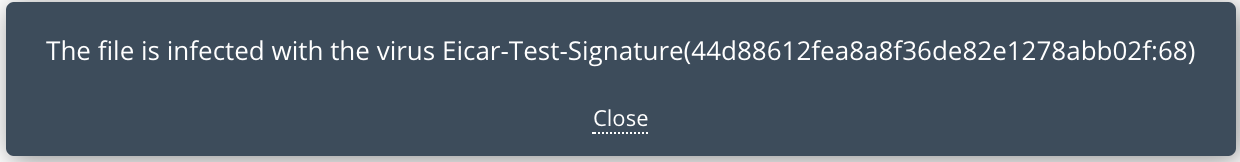 EICAR-testfile.txt failed to upload to myprovider/mybucket/myfolder . Antivirus ClamAV detected Eicar-Test-Signature(44d88612fea8a8f36de82e1278abb02f:68) infection. ClamAV version ClamAV 0.99.2/24211/