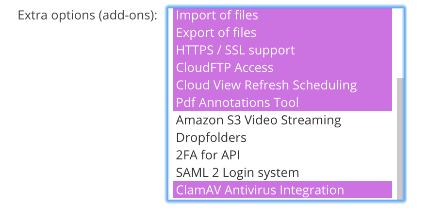 To make the ClamAV available as a configuration option for an organization tenant the feature must be added as an 'Extra option' in the User Package.