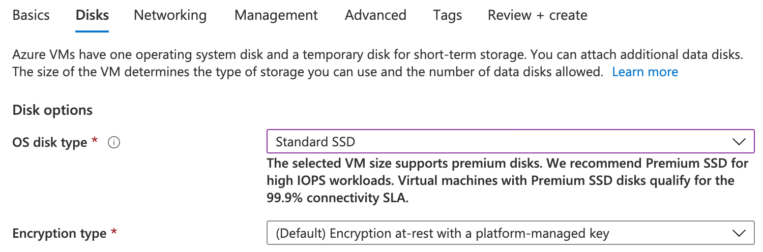Select “Next: Disks” and change the “OS disk type” to Standard SSD.