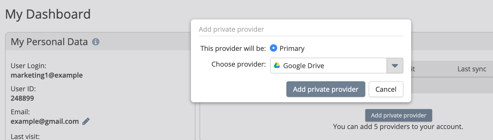 Remove Provider: If you choose to remove the provider you first must make sure it is not your default provider (you can change this from the 'My Dashboard' screen). Once it is not you can remove the provider which removes the link to Google Drive from your account.