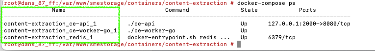 To see the containers that make up a containerized service, first run “docker -ps” as root from the service's directory. The container names are listed in the leftmost column, for example: