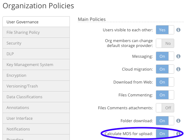 Note that MD5 hash values are not calculated for uploads that use M-Stream file transfer acceleration, nor for provider-to-provider copies of files that are encrypted with Access Anywhere's org. encryption.