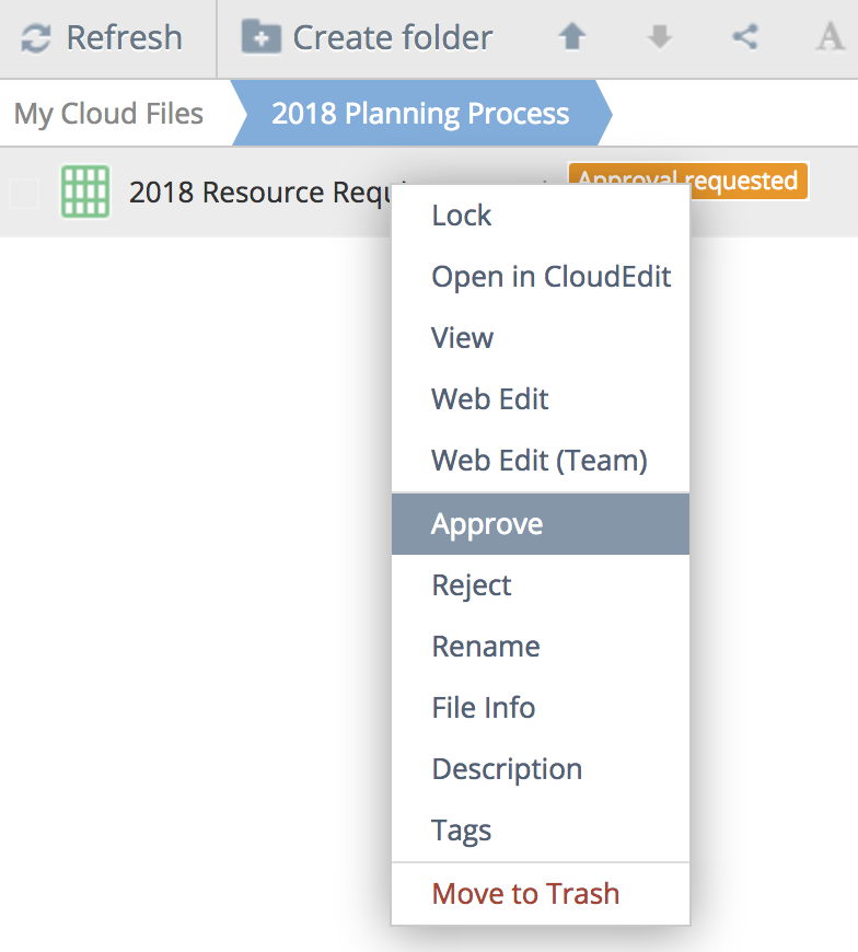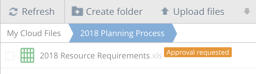 Bob has written a Resource Plan as part of the 2018 budgeting process. He needs to have it approved by his manager, Sue. Bob has saved the resource plan, which happens to be an Excel workbook, in an NAA folder on S3 that Sue has shared with him. He right-clicks on the file and selects the “Request approval” option. In the dialog box that pops up he selects Sue as the approver, and writes her a quick note in the Comment area. Then he clicks the “Request” button.