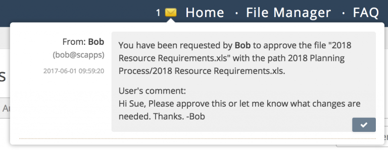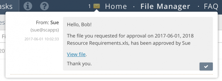 A moment later Sue sees a message in her browser and her email inbox telling her that Bob has requested that she approve a file.