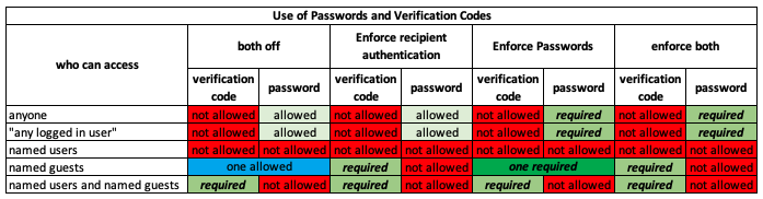 The rules for when passwords and verification codes can, cannot or must be used are determined by the contents of the “Who can access list” and the settings for the “Enforce Passwords” and “Enforce recipient authentication” policies. They are summarized in this table: