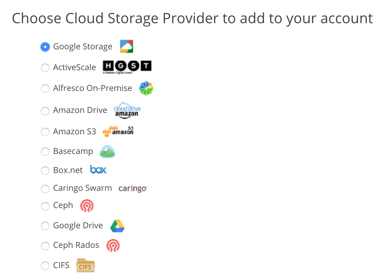 Select your provider and follow the instructions on the next couple of screens. See the next section for information on setting up Google Cloud Storage.