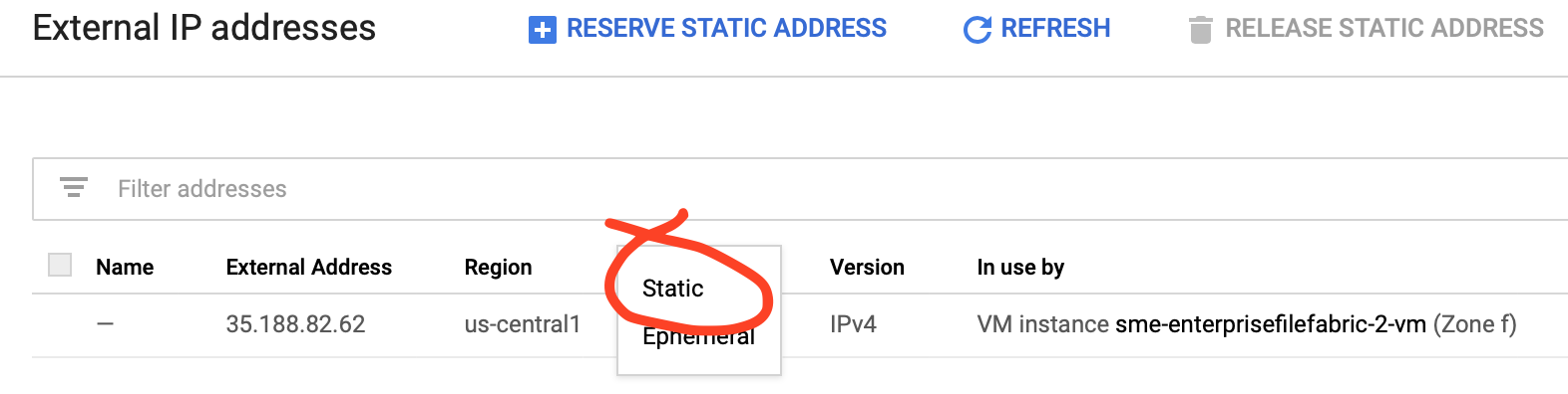 The external address of the appliance you just launched is listed as Type Ephemeral. Change it to Static, enter a Name in the dialog box and select RESERVE.