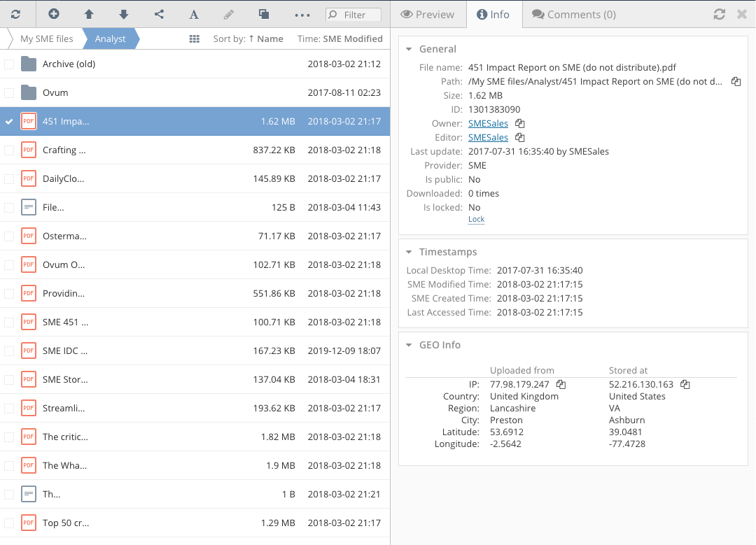 GEO locations are recorded with regards to where a file was uploaded from and also where a file was uploaded to. This can ensure companies comply with electronic data laws and international compliance regimes