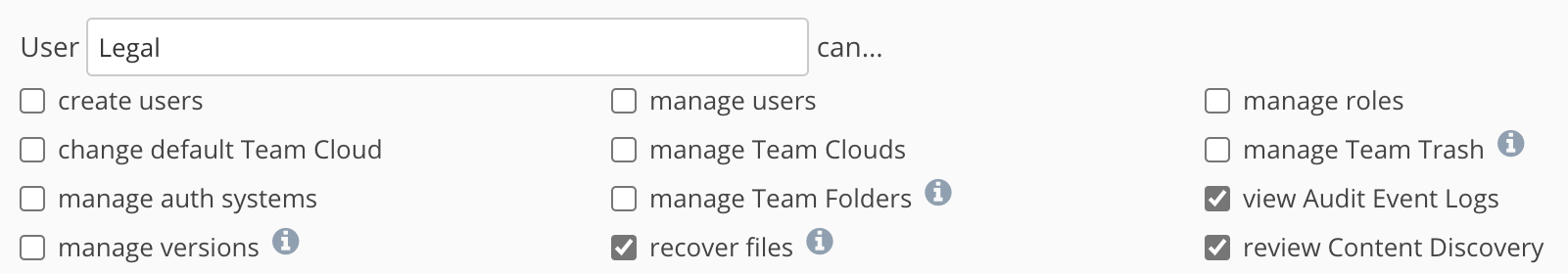 For example, users with the “Legal” role are able to view the Audit Event logs“ if that role has that capability checked: