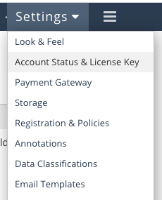 Once you have logged in to this account, from the top Settings menu, select Account Status and License Key.