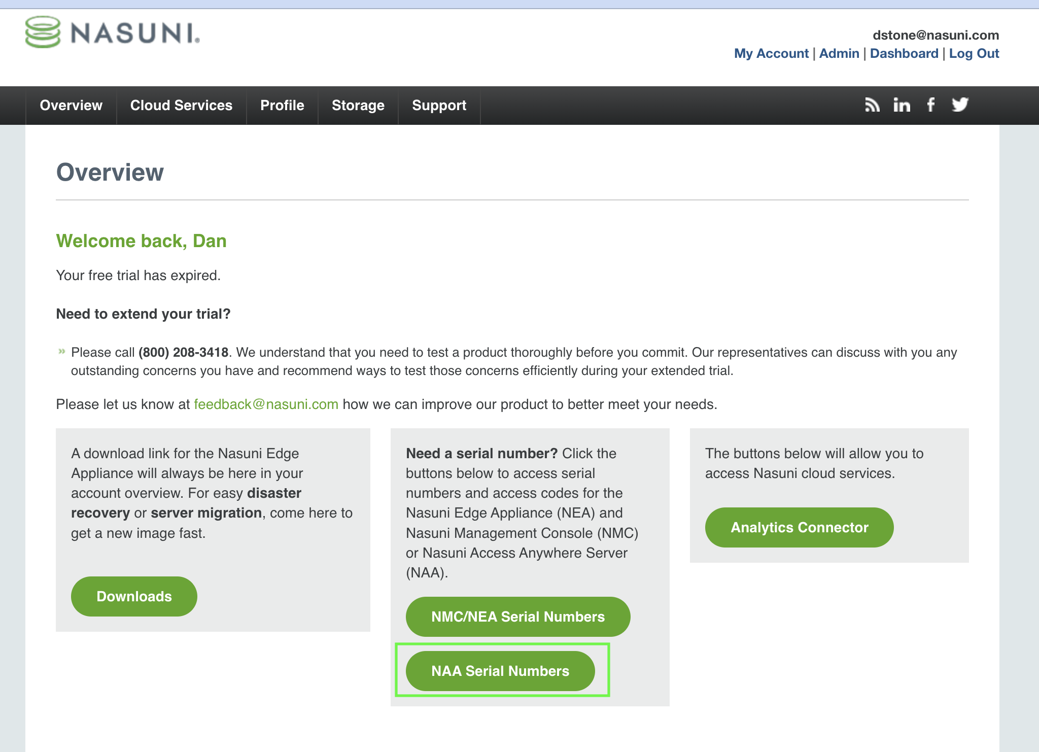 To get the serial number and Authorization code, log in to https://account.nasuni.com and choose “NAA Serial Numbers”.