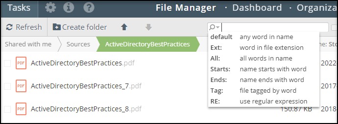 Note: When searching a list of folders, only folder names are included in the search results. A single folder search is required to search individual file names.