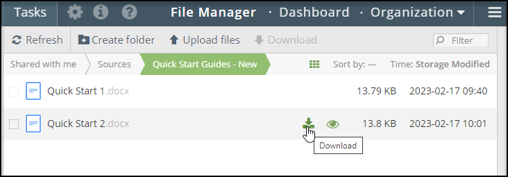 To download a file, hover over the file and click the download icon.