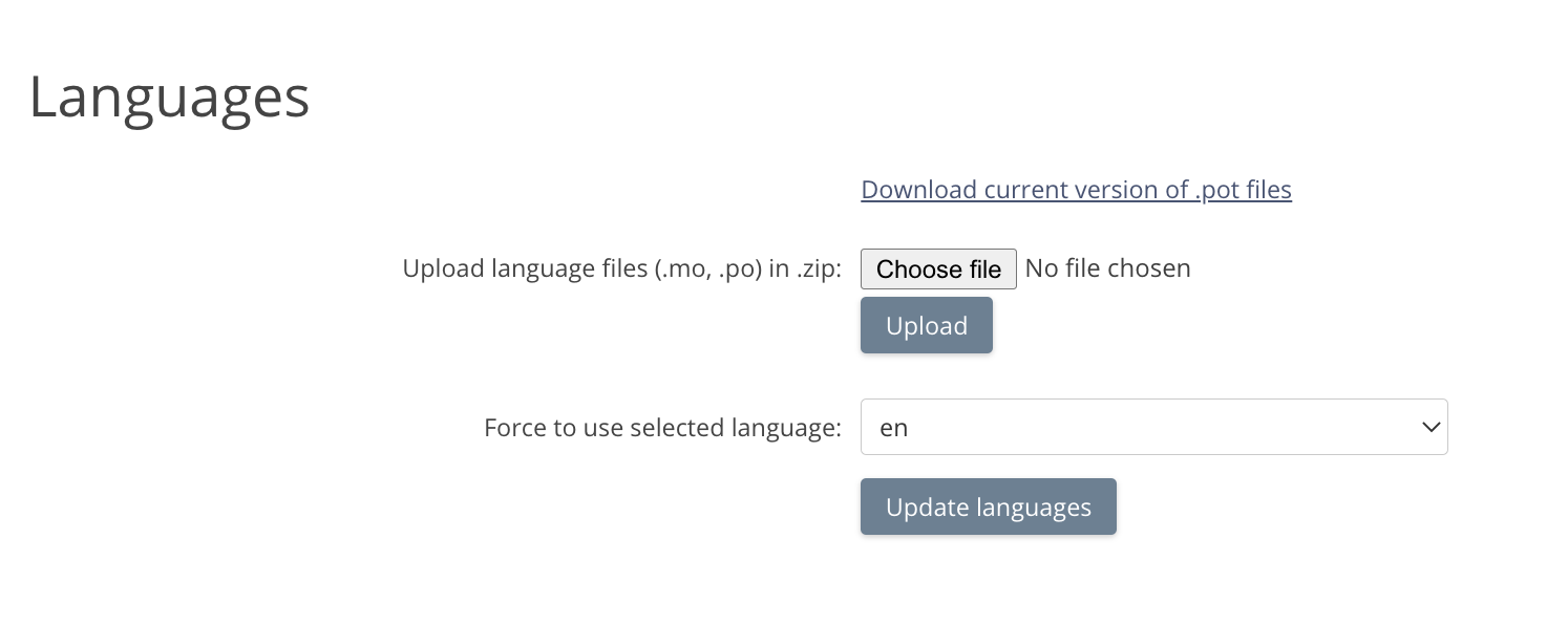 You can then revisit the Languages screen, and upload the ZIP file there. Once uploaded, your translations are then available and can be enabled.