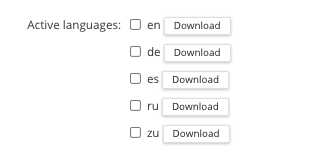- Active languages — This controls the active languages and download links to the translation files for available languages.